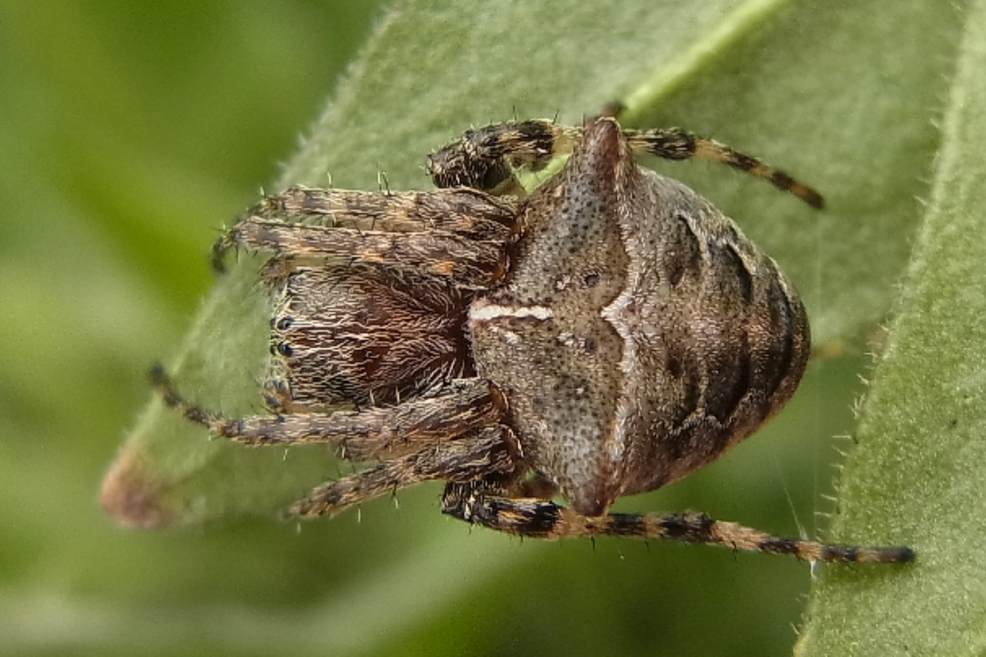 Die abgebildete Zweihöckrige Kreuzspinne (Gibbaranea bituberculata) sieht der Gehörnten Kreuzspinne zum Verwechseln ähnlich. Die helle, geschwungene Linie hinter den Höckern ist bei der letzteren aber in der Regel nicht ausgebildet. Foto: Irene Pardo