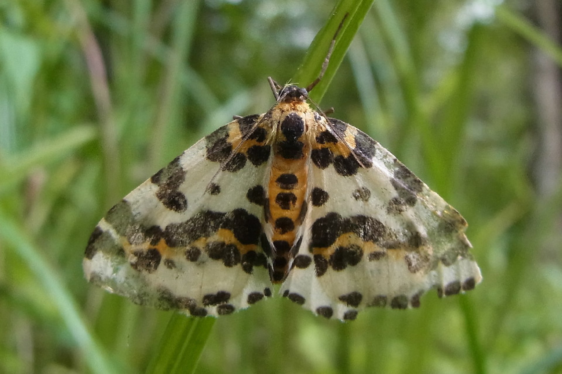 Den Stachelbeerspanner (Abraxas grossulariata) gilt in Brandenburg als stark gefährdet. Irene hat ihn im Spreewald gefunden, dort ist die Art noch relativ gut vertreten. Foto: Irene Pardo